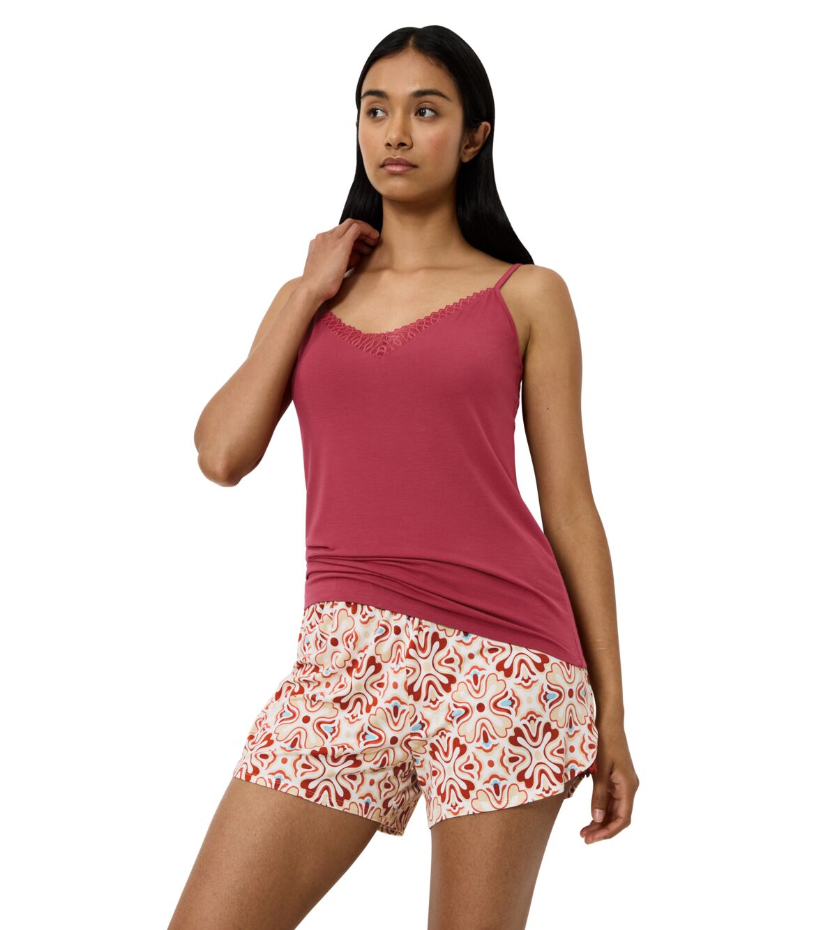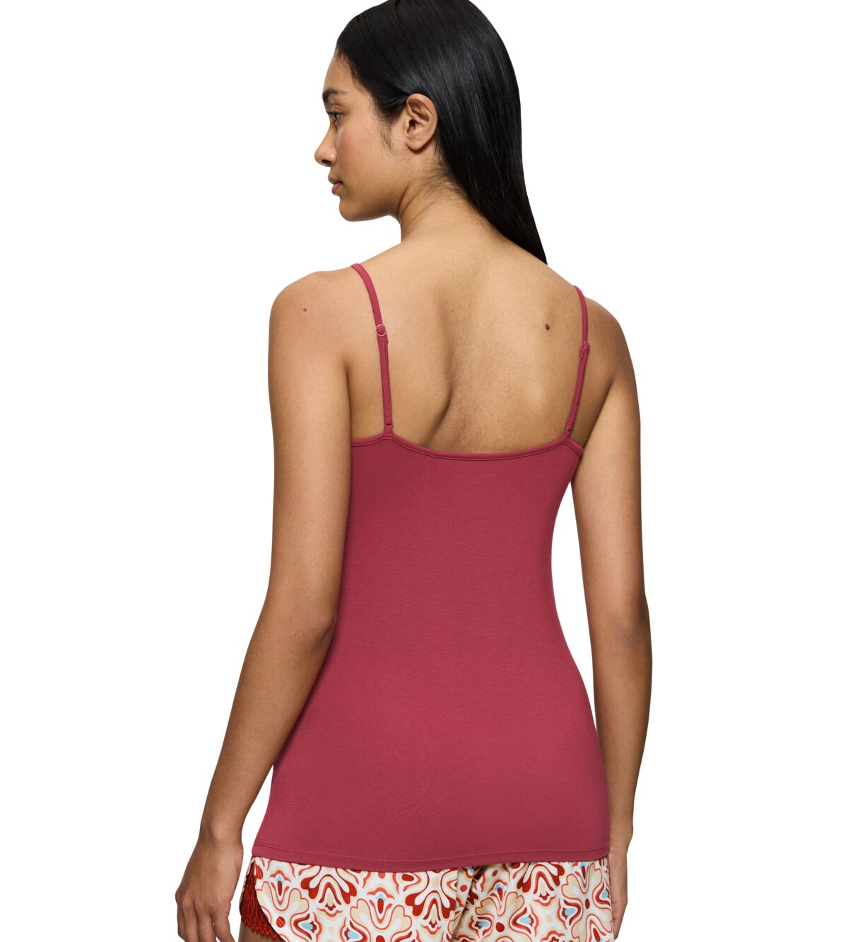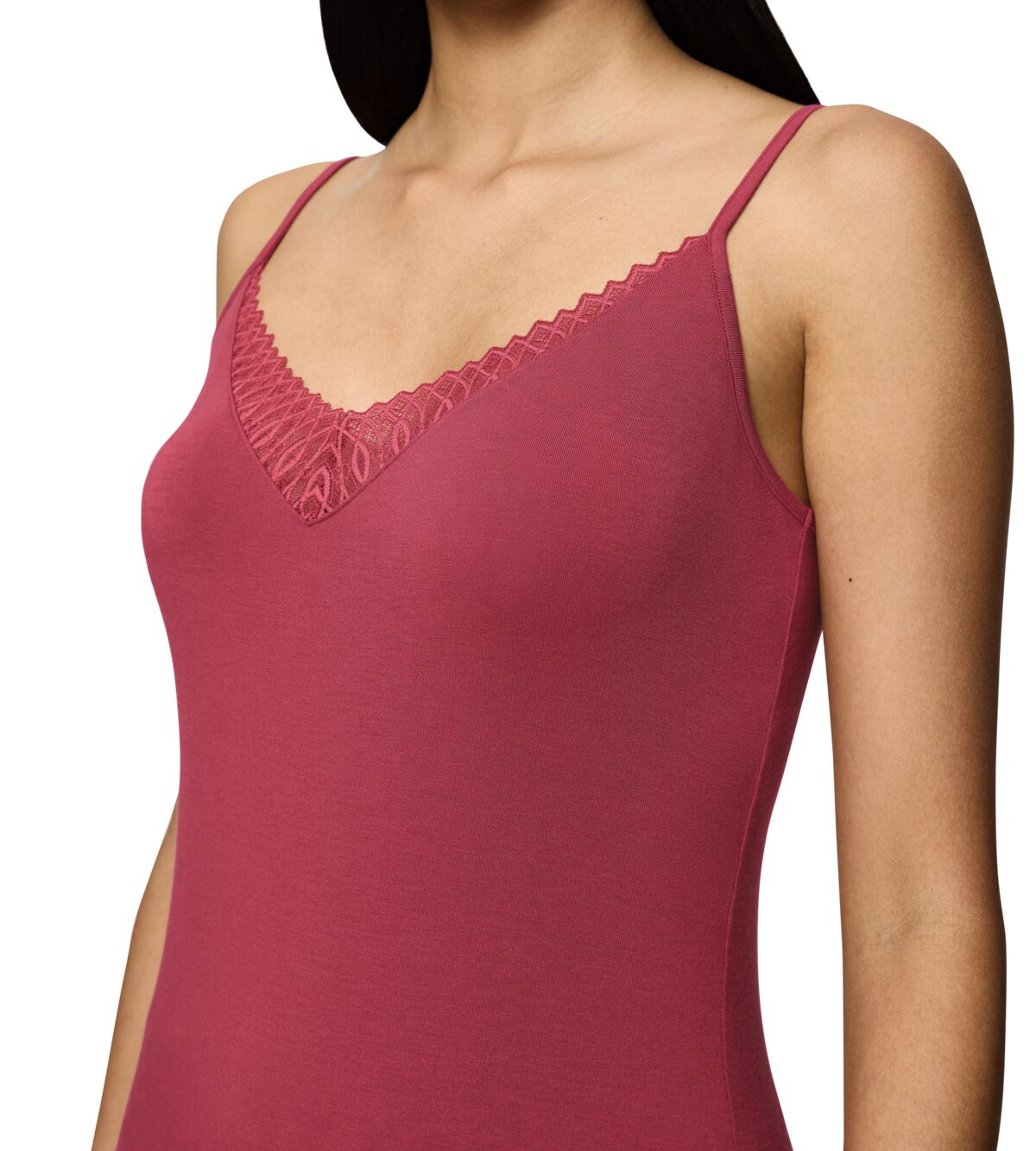 قميص داخلي سينشوال بحمالات اسباغيتي رفيعة مصنوع بالكامل تقريبًا من نسيج مودال تينسل™ الناعم والمرن، مما يضمن مظهرًا جذابًا. تضيف تفاصيل الدانتيل الرقيقة على طول خط العنق لمسة من الأناقة لمزيج مثالي من الإثارة والراحة.
